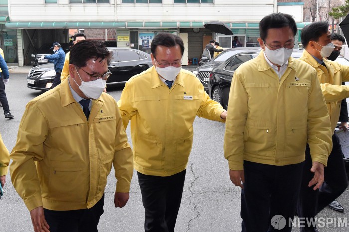 [인천=뉴스핌] 윤창빈 기자 = 김부겸(가운데) 국무총리가 10일 코로나19 오미크론 방역대책 보고 및 현장점검을 위해 찾은 인천 미추홀구청에서 박남춘(오른쪽) 인천시장과 김정식 미추홀구청장과 함께 대회의실로 향하고 있다. 2021.12.10 pangbin@newspim.com