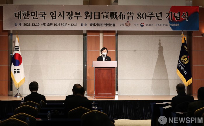 [서울=뉴스핌] 정일구 기자 = 윤주경 국민의힘 의원이 10일 오전 서울 용산구 백범김구기념관에서 열린 대한민국 임시정부 대일 선전포고 80주년 기념식에서 축사를 하고 있다. 2021.12.10 mironj19@newspim.com