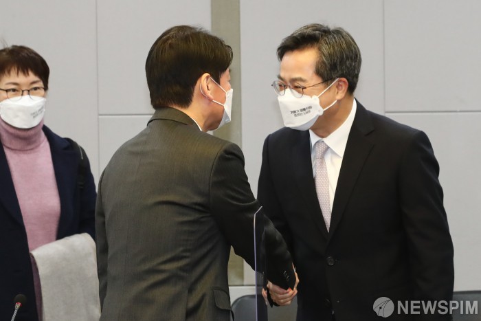 [서울=뉴스핌] 이형석 기자 = 안철수 국민의당 대선 후보(왼쪽)와 김동연 새로운물결(가칭) 대선후보가 13일 오전 국회 의원회관에서 열린 스타트업 미래의숲 1차포럼 '위기의 대학, 공유경제를 만나다'에서 인사하고 있다. 2021.12.13 leehs@newspim.com