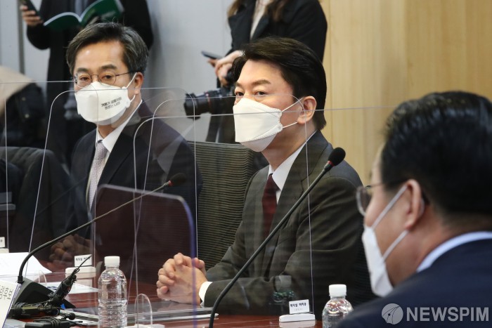 [서울=뉴스핌] 이형석 기자 = 안철수 국민의당 대선 후보(가운데)와 김동연 새로운물결(가칭) 대선후보(왼쪽)가 13일 오전 국회 의원회관에서 열린 스타트업 미래의숲 1차포럼 '위기의 대학, 공유경제를 만나다'에서 참석해 있다. 2021.12.13 leehs@newspim.com