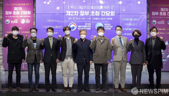 [서울=뉴스핌] 황준선 인턴기자 = 15일 오후 서울 서초구 드림플러스에서 열린 '혁신 스타트업 활성화를 위한 제2차 정부 초청 간담회'에서 권칠승 중소벤처기업부 장관(가운데)과 한정애 환경부 장관(오른쪽 두 번째), 김강립 식품의약품안전처 처장(왼쪽 두 번째)을 비롯한 스타트업 기업 대표들이 기념촬영을 하고 있다. 2021.12.15 hwang@newspim.com