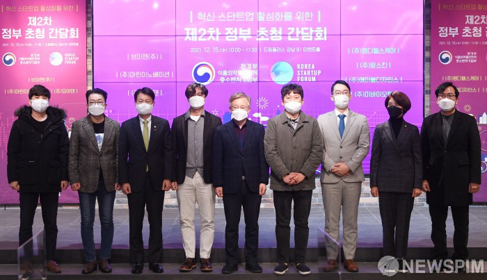 [서울=뉴스핌] 황준선 인턴기자 = 15일 오후 서울 서초구 드림플러스에서 열린 '혁신 스타트업 활성화를 위한 제2차 정부 초청 간담회'에서 권칠승 중소벤처기업부 장관(가운데)과 한정애 환경부 장관(오른쪽 두 번째), 김강립 식품의약품안전처 처장(왼쪽 두 번째)을 비롯한 스타트업 기업 대표들이 기념촬영을 하고 있다. 2021.12.15 hwang@newspim.com