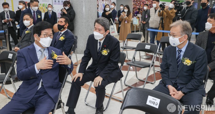 [서울=뉴스핌] 최상수 기자 = 박병석 국회의장, 이인영 통일부 장관, 권칠승 중소벤처기업부 장관이 16일 서울 여의도 국회의원회관에서 열린 2021 개성공단 우리기업 상품전시회 개막식에서 대화를 나누고 있다. 2021.12.16 kilroy023@newspim.com
