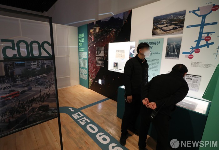 [서울=뉴스핌] 김민지 인턴기자 = 17일 오전 서울 종로구 대한민국역사박물관 다목적홀에서 열린 공간으로 보는 한국 현대사, 광화문 특별전에서 관람객들이 전시를 둘러보고 있다. 광화문 76년 변천사를 조명하는 이번 전시는 내년 3월 31일까지 열린다. 2021.12.17 kimkim@newspim.com