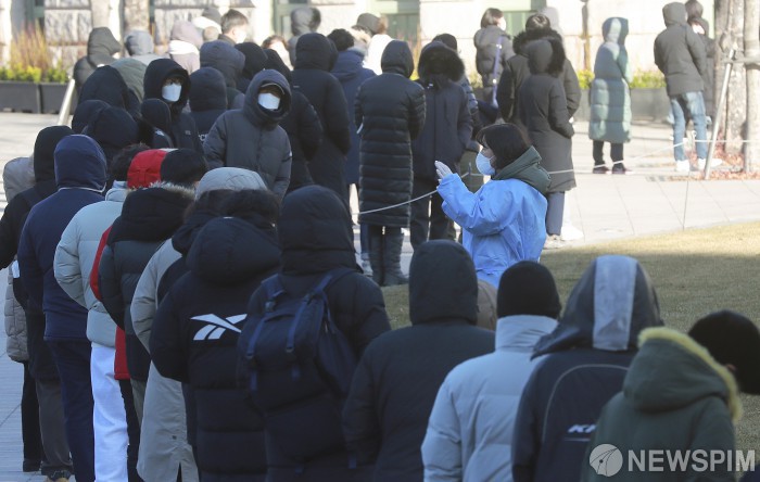 [서울=뉴스핌] 이형석 기자 = 서울의 최저 기온이 영하 6도를 기록한 18일 오전 서울 중구 서울광장 임시선별검사소에서 시민들이 두꺼운 옷을 입고 검사를 받기 위해 줄을 서 있다. 중앙방역대책본부는 코로나19 신규 확진자는 총 7,314명, 총 누적 확진자 수는 558,864명 이라고 밝혔다. 2021.12.18 leehs@newspim.com