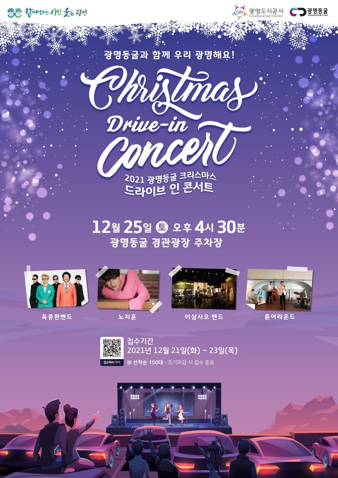 [광명=뉴스핌] 박승봉 기자 = 경기 광명도시공사는 오는 25일 크리스마스 오후 4시 30분부터 광명동굴 경관광장 주차장에서 '2021 광명동굴 크리스마스 드라이브 인 콘서트'를 개최한다고 20일 밝혔다.