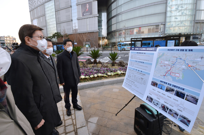 [부산=뉴스핌] 남동현 기자 = 박형준 부산시장이 20일 개통된 부산 중앙대로 서면 광무교에서 충무동 자갈치교차로까지 7.9km 구간 중 광복동에서 중앙대로 BRT 시설물을 점검하고 있다.