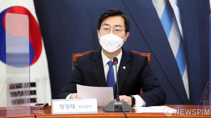 [서울=뉴스핌] 이형석 기자 = 장경태 더불어민주당 청년위원장이 21일 서울 여의도 국회에서 열린 '팀 공정의 목소리' 입당식 및 당대표 간담회에서 발언하고 있다. 2021.12.21 leehs@newspim.com