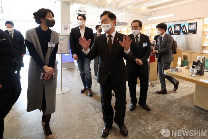 [서울=뉴스핌] 정일구 기자 = 박범계 법무부 장관이 21일 오후 서울 성동구 공간 와디즈에서 열린 스타트업 창업지원 법무플랫폼 자문단회의에 앞서 현장을 둘러보고 있다. 2021.12.21 mironj19@newspim.com
