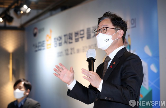 [서울=뉴스핌] 정일구 기자 = 박범계 법무부 장관이 21일 오후 서울 성동구 공간 와디즈에서 열린 스타트업 창업지원 법무플랫폼 자문단회의에 참석해 인사말을 하고 있다. 2021.12.21 mironj19@newspim.com