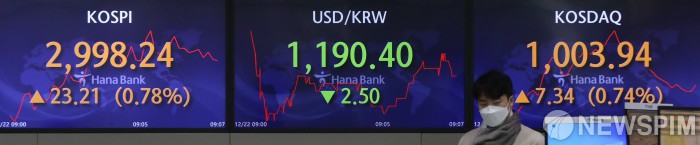 [서울=뉴스핌] 김민지 인턴기자 = 코스피가 전 거래일(2975.03)보다 18.47포인트(0.62%) 오른 2993.50에 시작한 22일 오전 서울 중구 하나은행 딜링룸에 지수가 표시돼있다. 이날 코스닥 지수는 전 거래일(996.60)보다 7.50포인트(0.75%) 상승한 1004.10에, 원·달러 환율은 전 거래일(1192.9원)보다 1.9원 내린 1191.0원에 거래를 시작했다. 2021.12.22 kimkim@newspim.com