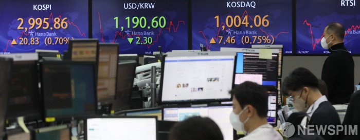 [서울=뉴스핌] 김민지 인턴기자 = 코스피가 전 거래일(2975.03)보다 18.47포인트(0.62%) 오른 2993.50에 시작한 22일 오전 서울 중구 하나은행 딜링룸에 지수가 표시돼있다. 이날 코스닥 지수는 전 거래일(996.60)보다 7.50포인트(0.75%) 상승한 1004.10에, 원·달러 환율은 전 거래일(1192.9원)보다 1.9원 내린 1191.0원에 거래를 시작했다. 2021.12.22 kimkim@newspim.com