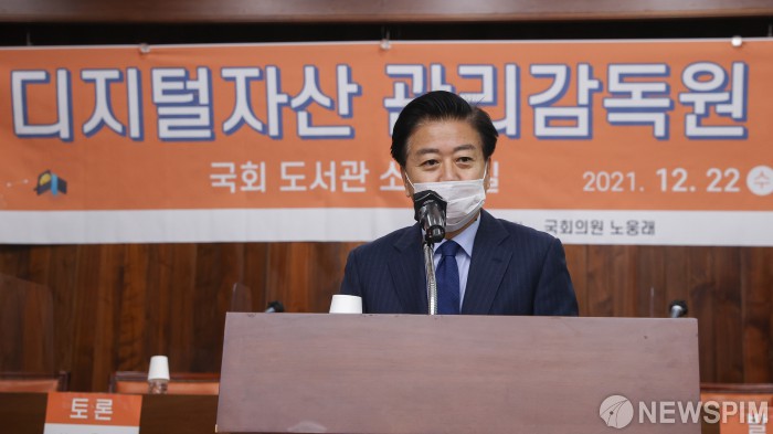 [서울=뉴스핌] 최상수 기자 = 노웅래 더불어민주당 의원이 22일 오전 서울 여의도 국회도서관에서 열린 '디지털자산 관리감독원 설립 토론회'에서 환영사를 하고 있다. 2021.12.22 kilroy023@newspim.com
