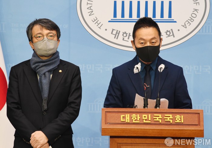 [서울=뉴스핌] 이형석 기자 = 더불어민주당과 열린민주당 합당 관련해 김의겸 열린민주당 의원(좌측)과 정봉주 통합 협상단 단장이 22일 국회 소통관에서 통합조건으로 7대 개혁 과제를 제안하는 기자회견을 하고 있다. 2021.12.22 leehs@newspim.com