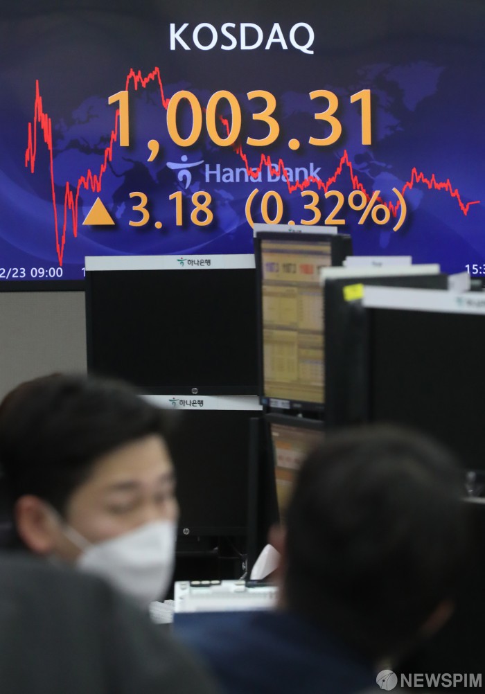 [서울=뉴스핌] 김민지 인턴기자 = 23일 코스닥은 전 거래일(1000.13)보다 3.18포인트(0.32%) 상승한 1003.31에 장을 마감했다. 사진은 이날 오후 하나은행 딜링룸 모습. 2021.12.23 kimkim@newspim.com