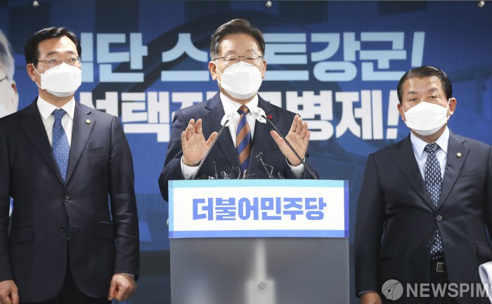 [서울=뉴스핌] 이형석 기자 = 이재명 더불어민주당 대선 후보가 24일 오후 서울 여의도 중앙당사에서 '스마트강군, 선택적 모병제' 공약 발표를 하고 있다. 2021.12.24 leehs@newspim.com