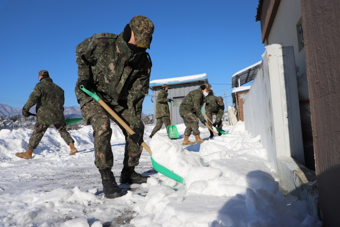 [양양=뉴스핌] 이형섭 기자 = 육군8군단 102기갑여단 일출포병대대가 긴급 제설 대민지원에 나섰다.
