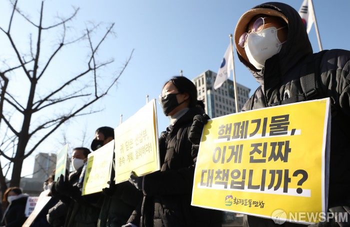 [서울=뉴스핌] 김민지 인턴기자 = 고준위핵폐기물전국회의 회원들이 27일 오전 서울 종로구 정부서울청사 앞에서 고준위방사성폐기물 기본계획 심의 중단 촉구 기자회견을 하고 있다. 2021.12.27 kimkim@newspim.com