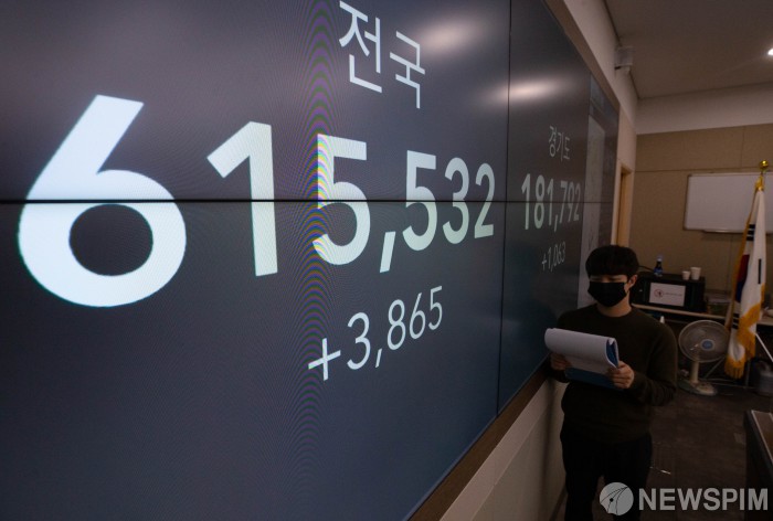 [성남=뉴스핌] 윤창빈 기자 = 28일 오후 경기 성남시 성남시청 재난안전상황실 전광판에 코로나 신규 확진자와 누적 확진자가 표시되고 있다. 이날 0시 기준 코로나19 신규 확진자는 3865명을 기록했다. 3000명대 확진자는 지난달 30일 3032명 이후 28일 만이다. 2021.12.28 pangbin@newspim.com