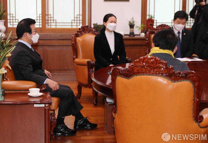 [서울=뉴스핌] 최상수 기자 = 박병석 국회의장이 쌍특검의 연내 처리를 위한 본회의 개최를 촉구하기 위해 29일 국회의장실을 방문한 정의당 배진교·국민의당 권은희 원내대표와 대화하고 있다. 2021.12.29 kilroy023@newspim.com