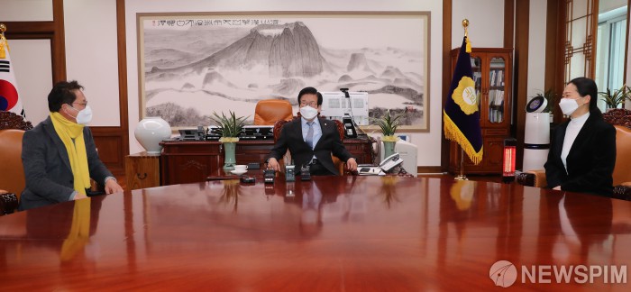 [서울=뉴스핌] 최상수 기자 = 박병석 국회의장이 쌍특검의 연내 처리를 위한 본회의 개최를 촉구하기 위해 29일 국회의장실을 방문한 정의당 배진교, 국민의당 권은희 원내대표와 대화하고 있다. 2021.12.29 kilroy023@newspim.com