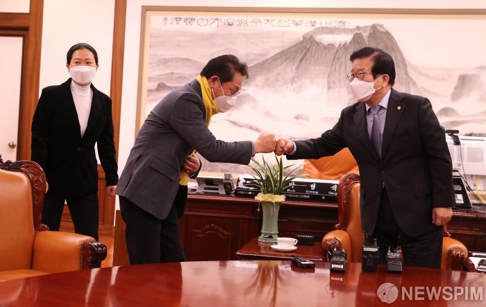 [서울=뉴스핌] 최상수 기자 = 박병석 국회의장(오른쪽)이 쌍특검의 연내 처리를 위한 본회의 개최를 촉구하기 위해 29일 국회의장실을 방문한 정의당 배진교 원내대표와 인사하고 있다. 왼쪽 국민의당 권은희 원내대표. 2021.12.29 kilroy023@newspim.com