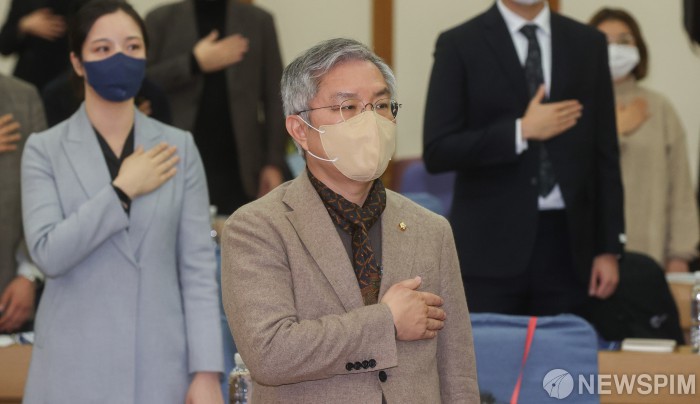 [서울=뉴스핌] 최상수 기자 = 최강욱 열린민주당 대표가 29일 서울 여의도 국회 의원회관에서 열린 더불어민주당 대한민국 대전환 선거대책위원회 평화외교안보특별위원회 발대식에서 국민의례를 하고 있다. 2021.12.29 kilroy023@newspim.com