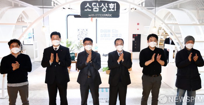 [서울=뉴스핌] 정일구 기자 = 29일 오후 서울 용산구 블루스퀘어에서 열린 소담상회 개장식에서 박치형 중소벤처기업부 소상공인정책관과 강동화 인터파크 대표이사 등 참석자들이 기념촬영을 하고 있다. 2021.12.29 mironj19@newspim.com