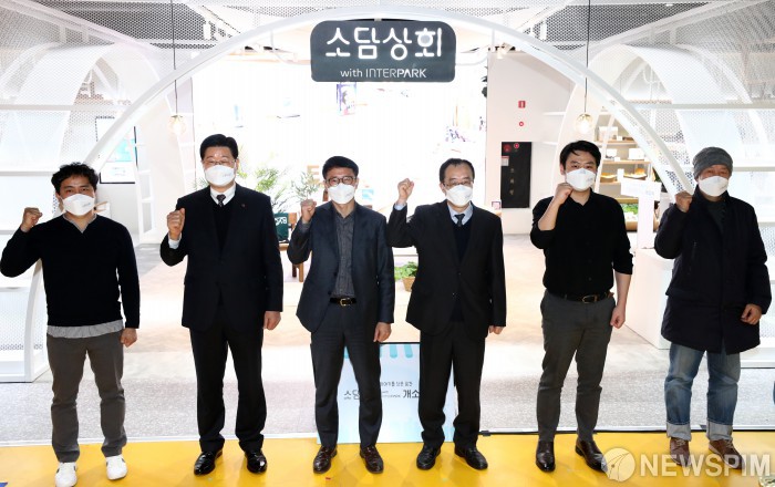[서울=뉴스핌] 정일구 기자 = 29일 오후 서울 용산구 블루스퀘어에서 열린 소담상회 개장식에서 박치형 중소벤처기업부 소상공인정책관과 강동화 인터파크 대표이사 등 참석자들이 기념촬영을 하고 있다. 2021.12.29 mironj19@newspim.com