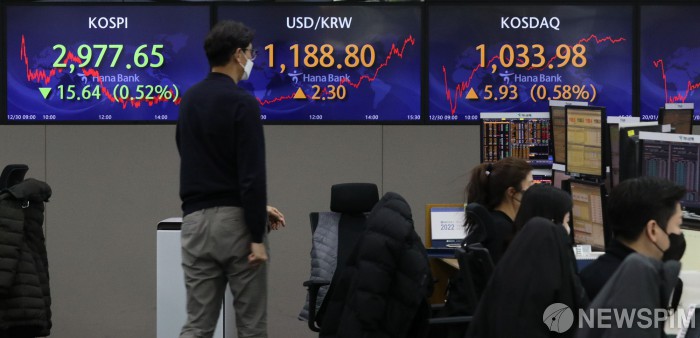 [서울=뉴스핌] 황준선 인턴기자 = 30일 코스피는 전 거래일(2993.29)보다 15.64포인트(0.52%) 내린 2977.65에 마감했다. 코스닥지수는 전 거래일(1028.05)보다 5.93포인트(0.58%) 오른 1033.98에 거래를 마쳤다. 원·달러 환율은 전 거래일(1186.5원)보다 2.3원 오른 1188.8원에 문을 닫았다. 이날 오후 서울 중구 하나은행 딜링룸 전광판에 지수가 표시돼 있다. 2021.12.30 hwang@newspim.com