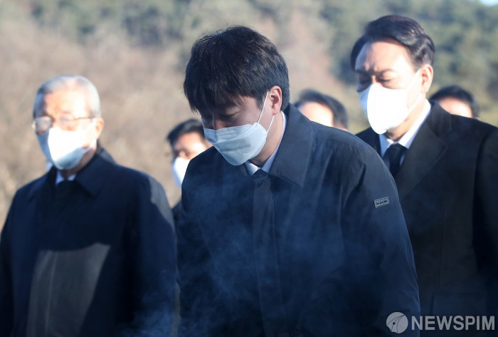 [서울=뉴스핌] 김학선 기자 = 이준석 국민의힘 대표가 임인년(壬寅年) 새해 첫날인 1일 오전 서울 동작구 국립서울현충원을 참배하며 현충탑에 분향하고 있다. 2022.01.01 yooksa@newspim.com