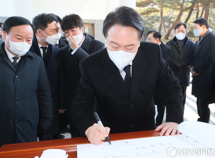 [서울=뉴스핌] 김학선 기자 = 국민의힘 윤석열 대선 후보가 1일 오전 서울 동작구 국립서울현충원을 참배한 뒤 방명록을 작성하고 있다. 윤 후보 뒤로 김기현 원내대표와 대화하는 이준석 대표가 보인다. 2022.01.01 yooksa@newspim.com