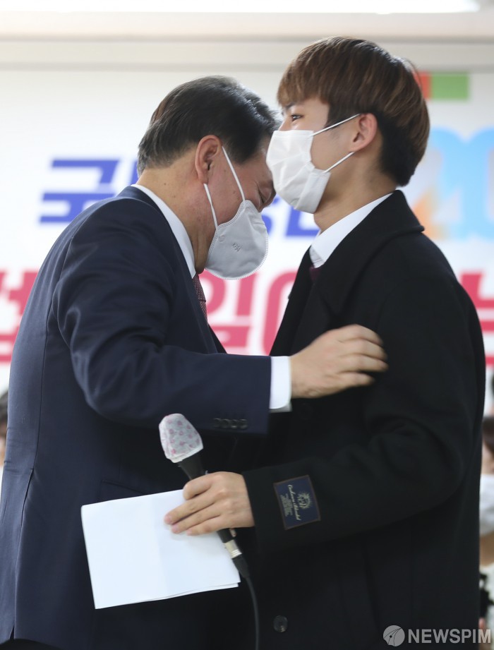[서울=뉴스핌] 김학선 기자 = 윤석열 국민의힘 대선 후보가 1일 서울 여의도 대하빌딩에서 열린 국민의힘 선대위 신년인사회에 참석해 젠더 관련 발언을 마친 곽승용 청년보좌역을 안아주고 있다. 2022.01.01 yooksa@newspim.com