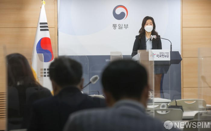 [서울=뉴스핌] 최상수 기자 = 이종주 통일부 대변인이 3일 오전 서울 종로구 정부서울청사에서 정례 브리핑을 하고 있다. 2022.01.03 kilroy023@newspim.com
