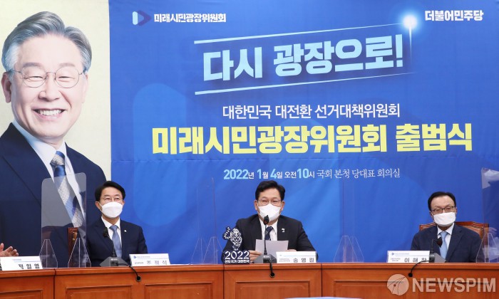 [서울=뉴스핌] 이형석 기자 = 송영길 더불어민주당 선대위원장이 4일 오전 서울 여의도 국회에서 열린 대한민국 대전환 선거대책위원회 미래시민광장위원회 출범식에서 축사를 하고 있다. 2022.01.04 leehs@newspim.com
