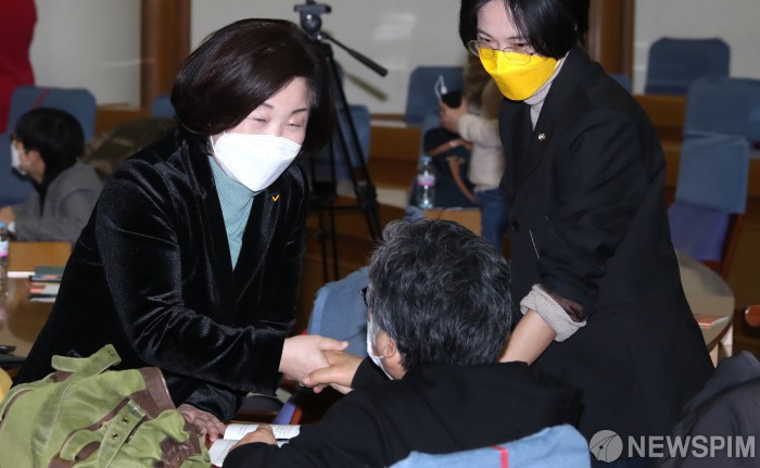 [서울=뉴스핌] 이형석 기자 = 심상정 정의당 대선후보(왼쪽)가 4일 오전 국회 의원회관에서 열린 '가족 구성권' 정책간담회에 참석해 토론자들과 인사하고 있다. 2022.01.04 leehs@newspim.com