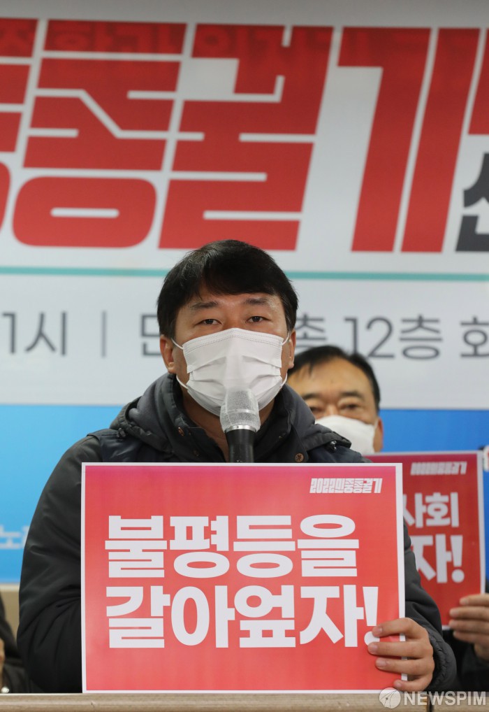 [서울=뉴스핌] 황준선 인턴기자 = 양경수 전국민주노동조합총연맹 위원장이 4일 오전 서울 중구 전국민주노동조합총연맹에서 열린 2022 민중총궐기 선언 기자회견에서 발언하고 있다. 2022.01.04 hwang@newspim.com