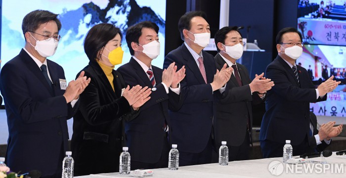 [서울=뉴스핌] 정일구 기자 = 김부겸 국무총리와 김기문 중소기업중앙회 회장을 비롯한 중소기업인, 여야 대선 후보 등이 5일 오후 서울 영등포구 중소기업중앙회에서 열린 2022 중소기업인 신년 인사회에 참석해 중소기업인들의 발전을 기원하며 박수를 치고 있다. 오른쪽부터 김 총리, 김 회장, 윤석열 국민의힘 대선 후보, 안철수 국민의당 대선 후보, 심상정 정의당 대선 후보, 김동연 새로운물결 대선 후보. 2022.01.05 mironj19@newspim.com