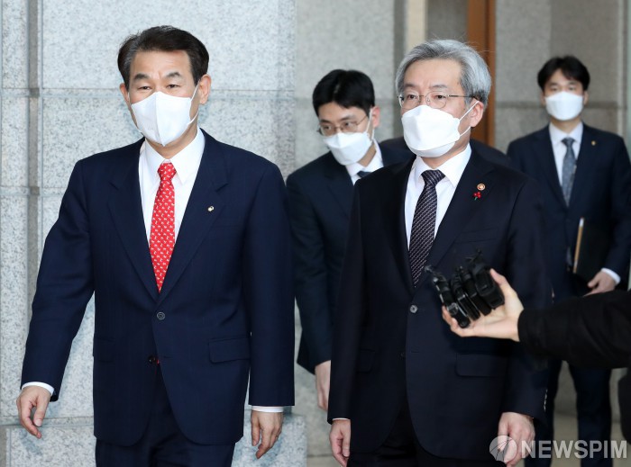 [서울=뉴스핌] 정일구 기자 = 고승범 금융위원장(오른쪽)과 정은보 금융감독원장이 6일 오전 서울 여의도 금융감독원에서 신년 회동을 마치고 이동하고 있다. 2022.01.06 mironj19@newspim.com