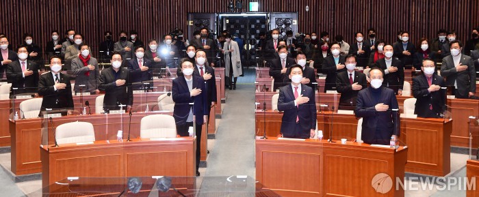 [서울=뉴스핌] 최상수 기자 = 윤석열 국민의힘 대선후보 등이 6일 서울 여의도 국회에서 열린 국민의힘 ‘변화와 단결’ 의원총회에서 국민의례를 하고 있다. 2022.01.06 kilroy023@newspim.com