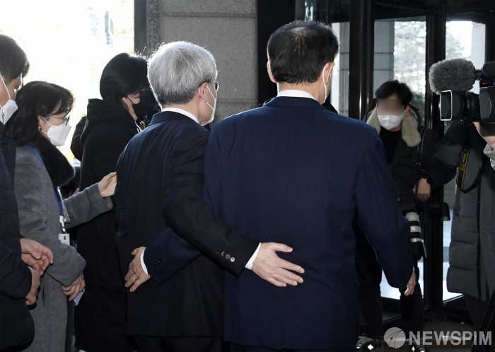 [서울=뉴스핌] 정일구 기자 = 고승범 금융위원장(왼쪽)과 정은보 금융감독원장이 6일 오전 서울 여의도 금융감독원에서 신년 회동을 마치고 서로 격려하며 이동하고 있다. 2022.01.06 mironj19@newspim.com