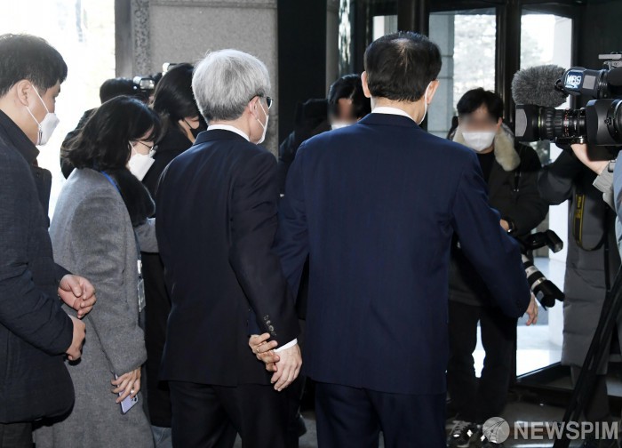 [서울=뉴스핌] 정일구 기자 = 고승범 금융위원장(왼쪽)과 정은보 금융감독원장이 6일 오전 서울 여의도 금융감독원에서 신년 회동을 마치고 서로 격려하며 이동하고 있다. 2022.01.06 mironj19@newspim.com