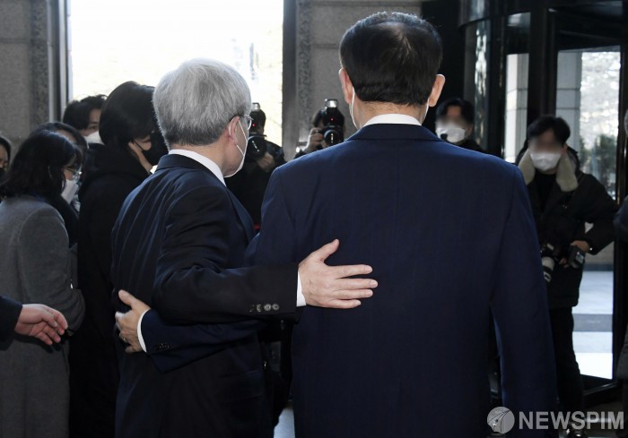 [서울=뉴스핌] 정일구 기자 = 고승범 금융위원장(왼쪽)과 정은보 금융감독원장이 6일 오전 서울 여의도 금융감독원에서 신년 회동을 마치고 서로 격려하며 이동하고 있다. 2022.01.06 mironj19@newspim.com