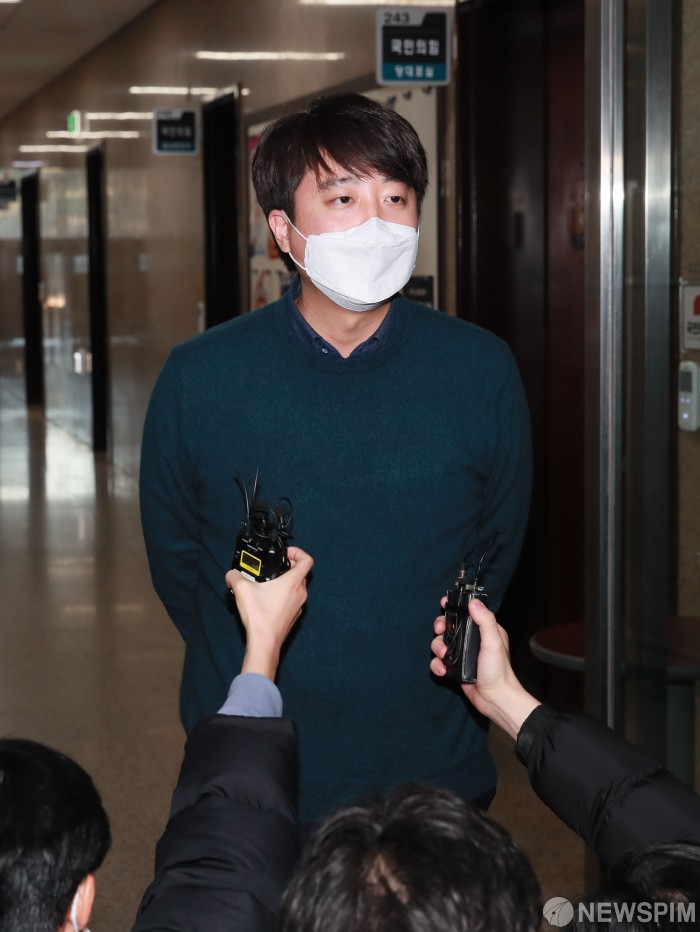 [서울=뉴스핌] 최상수 기자 = 이준석 국민의힘 대표가 6일 오후 서울 여의도 국회 당대표실 앞에서 입장 발표를 하고 있다. 2022.01.06 kilroy023@newspim.com