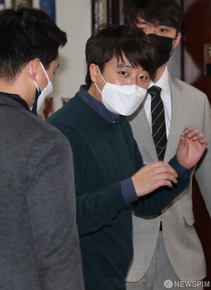 [서울=뉴스핌] 최상수 기자 = 이준석 국민의힘 대표가 6일 오후 서울 여의도 국회 당대표실 앞에서 발언을 마친 후 다시 대표실로 들어가고 있다. 2022.01.06 kilroy023@newspim.com