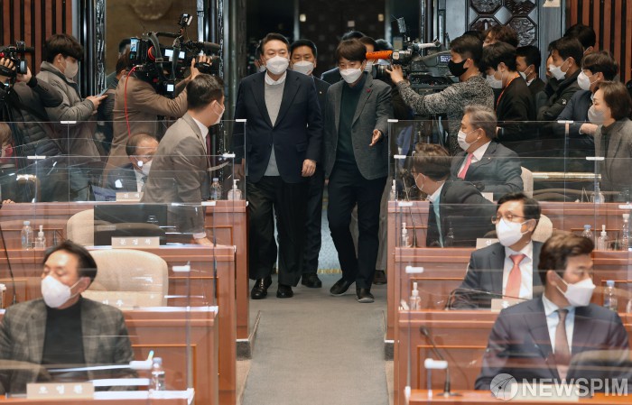 [서울=뉴스핌] 최상수 기자 = 윤석열 국민의힘 대선 후보와 이준석 대표가 6일 서울 여의도 국회에서 단독 회동을 마치고 의원총회장으로 들어오고 있다. 2022.01.06 kilroy023@newspim.com