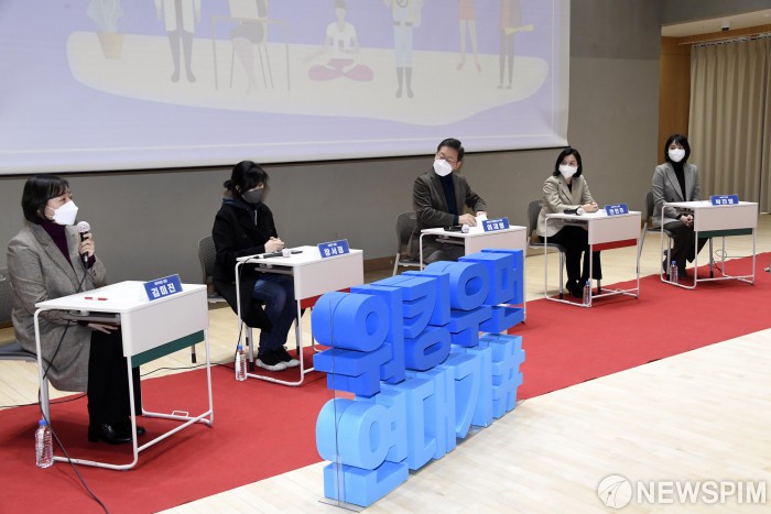 [서울=뉴스핌] 국회사진취재단 = 이재명 더불어민주당 대통령 후보는 10일 동작구 대방동 페이스살림에서 열린 일하는 여성을 위한 스타트업 대표 간담회에 참석, 참석자들의 이야기를 경청하고 있다. 2022.01.10 photo@newspim.com