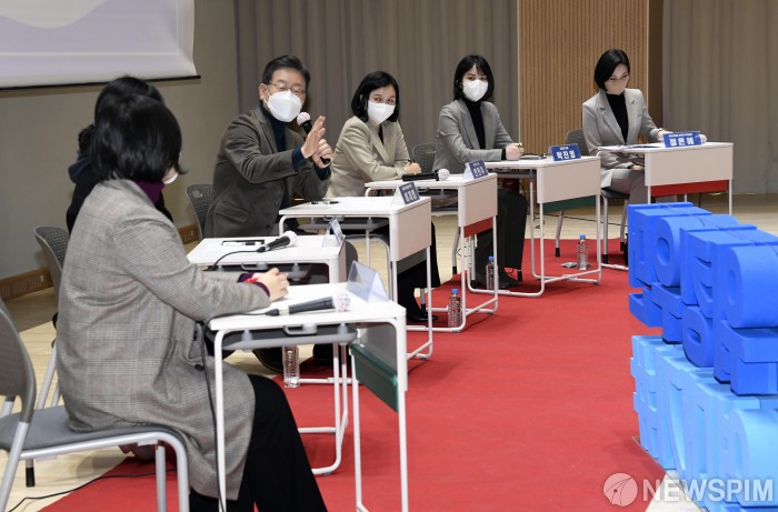 [서울=뉴스핌] 국회사진취재단 = 이재명 더불어민주당 대통령 후보는 10일 동작구 대방동 페이스살림에서 열린 일하는 여성을 위한 스타트업 대표 간담회에 참석하여 발언하고 있다. 2022.01.10 photo@newspim.com