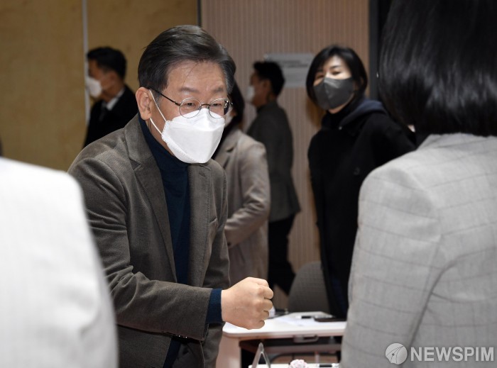 [서울=뉴스핌] 국회사진취재단 = 이재명 더불어민주당 대통령 후보는 10일 동작구 대방동 페이스살림에서 열린 일하는 여성을 위한 스타트업 대표 간담회에서 참석자들과 인사를 하고 있다. 2022.01.10 photo@newspim.com
