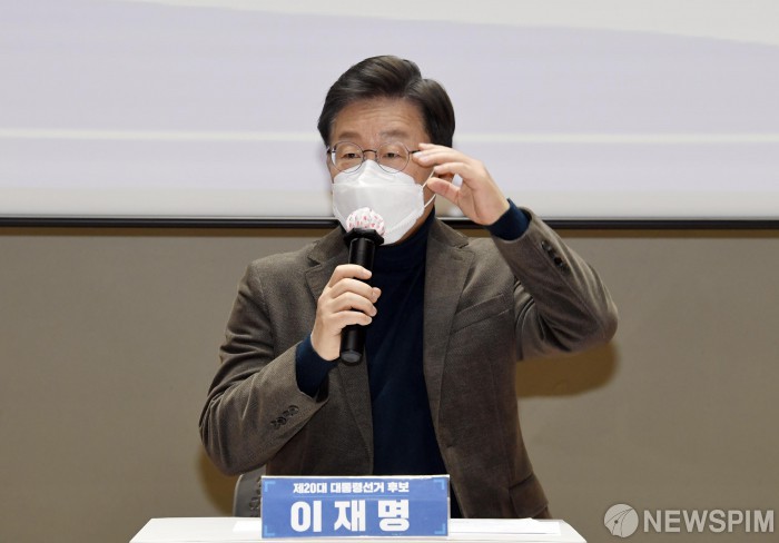 [서울=뉴스핌] 국회사진취재단 = 이재명 더불어민주당 대통령 후보는 10일 동작구 대방동 페이스살림에서 열린 일하는 여성을 위한 스타트업 대표 간담회에서 인사말을 하고 있다. 2022.01.10 photo@newspim.com